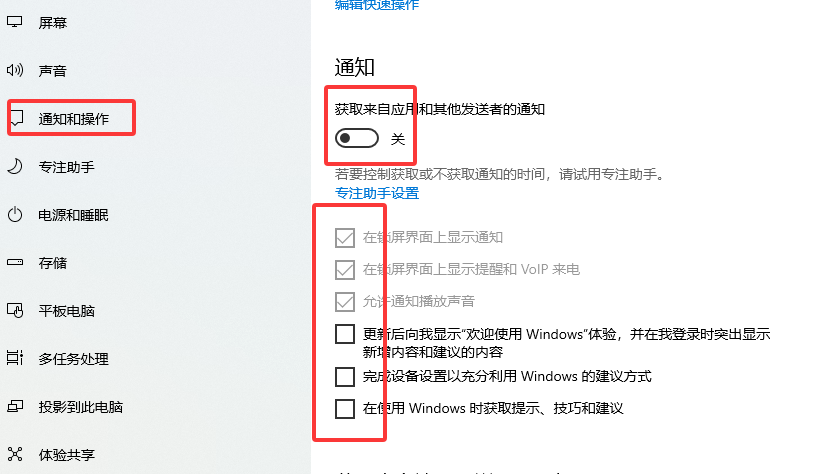 1、win+i,打开设置,点击系统,点“通知和操作”,把所有通知都关闭。这东西会出现弹窗,特别是打游戏时,突然弹出,很是烦人。