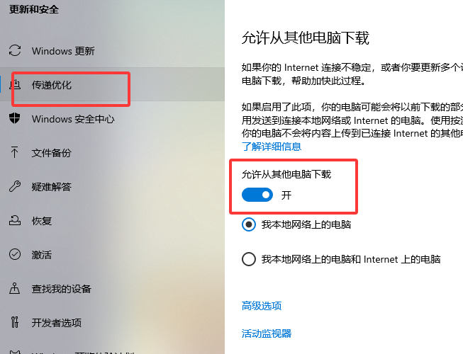4、打开“更新和安全”,把“传递优化”里的“允许从其他电脑下载”关闭,这个设置会偷偷占用你的带宽。