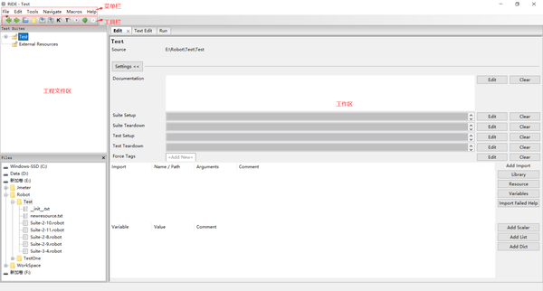 RIDE的界面主要分成了4个区域:菜单栏,工具栏,工程文件区,工作区,如下图所示: