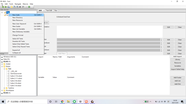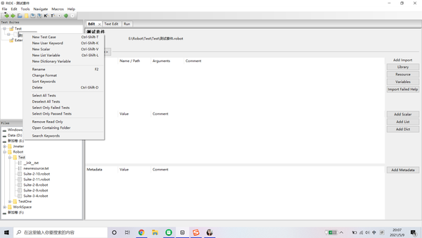 在“测试套件”上单击鼠标右键,弹出快捷菜单,如下图所示: