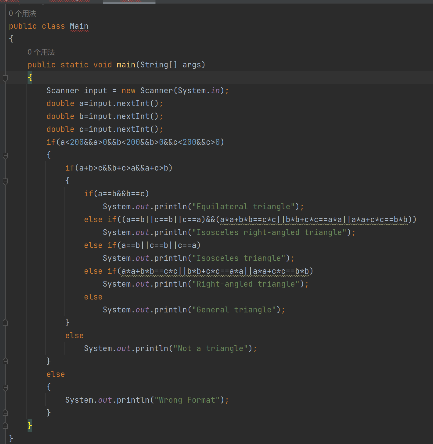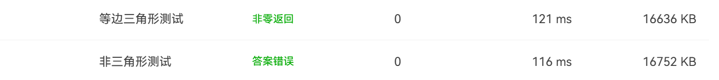 可这也出现了一些问题,就是在判断是否为等边三角形时,我输入了当三条边相等且为三角形时,依旧报错,询问同学后发现其实时我的代码