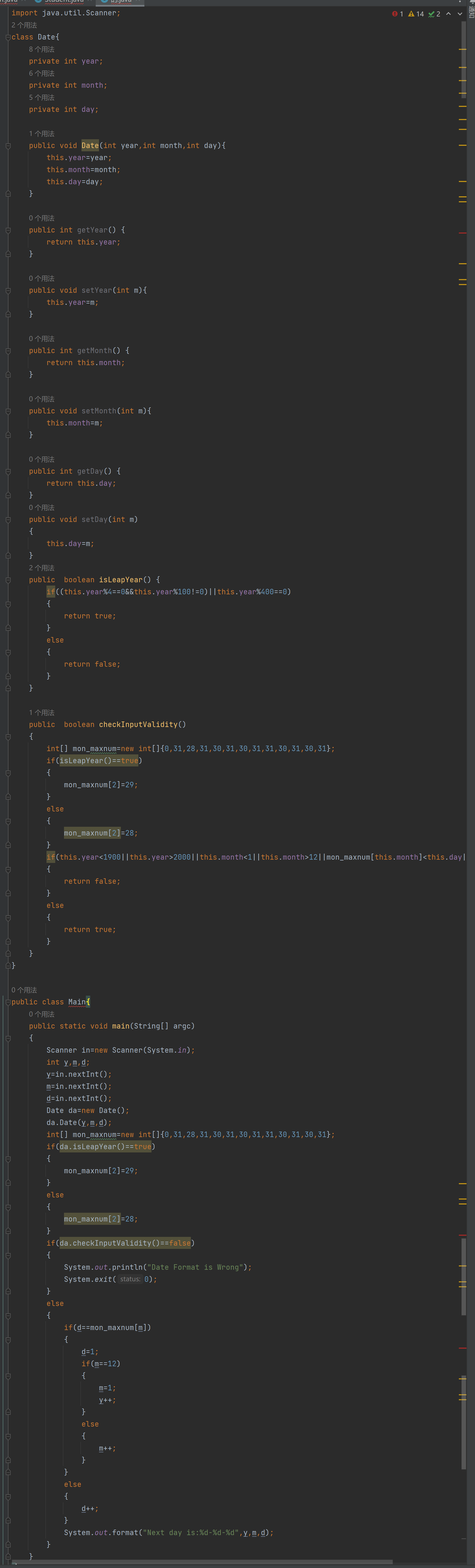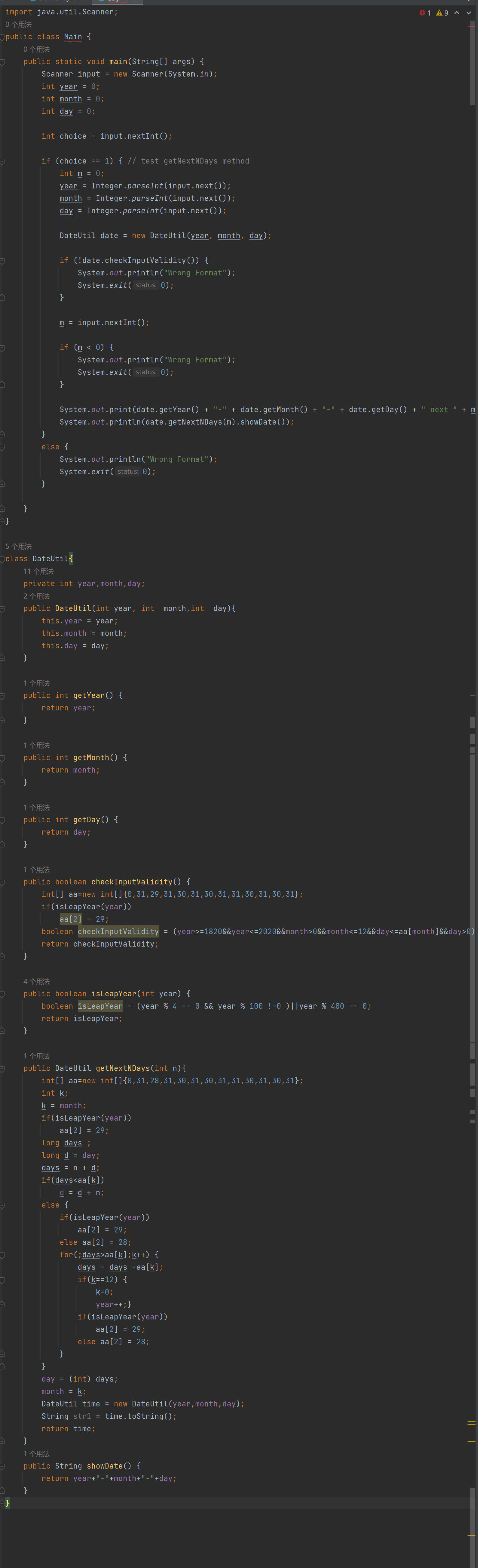 这是7-3的升级版,增加了7-3的功能,求输入天数的前n天以及后n天,相差几天的功能,比较不一样的是年份范围的不同,原本顺手打的和7-3一样的数据范围却发现过不了,调试才调出来发现是数据范围的不对。后来再写完代码后与同学讨论,也学到了许多不同的想法,算相差天数中,我是先算该日期在该年的第几天,再减年份,而有的同学则是一个月一个月的减。