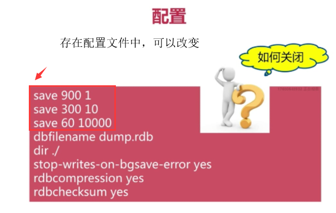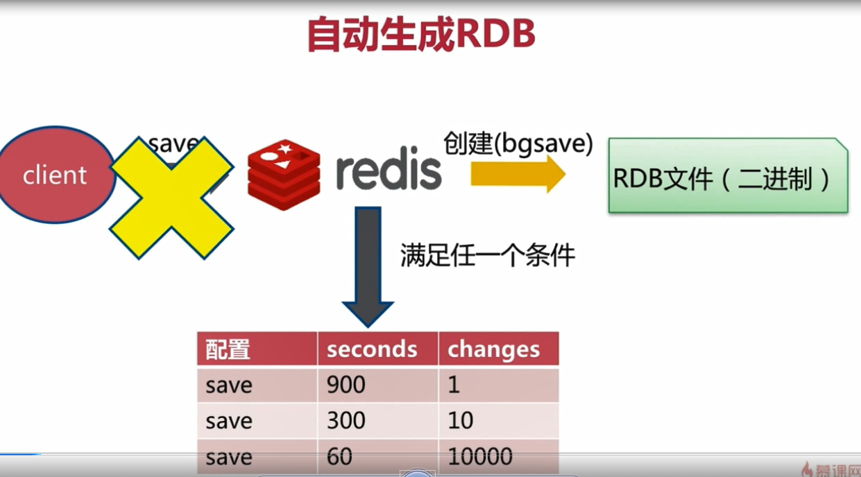 自动生成RDB文件,60s发生10000次改变或者300s发生10次改变或者900s发生一次改变满足任意一个条件就会自动生成RDB文件,实际上是内部执行了bgsave,无法控制,