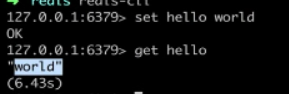 另外一个窗口,获取hello,此时发现get hello 是阻塞的,因为他在save后执行的,阻塞了6.43s