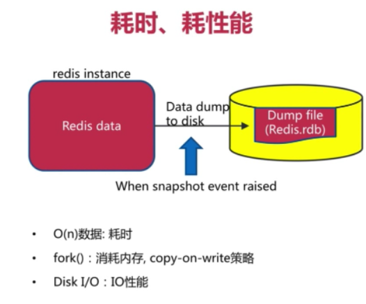 rdb文件的生成过程就是将redis中的数据dump到磁盘中,形成rdb文件,将所有文件都dump到硬盘中,耗时,写也会消耗cpu,bgsave会执行fork()出新进程,消耗内存,还有I/O性能消耗