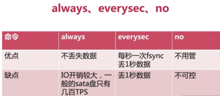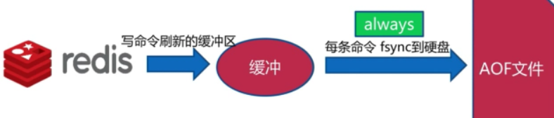always:reids将写命令写到硬盘的缓冲区,然后按照一定的策略,刷新到磁盘中,为了提高写入效率,always是指每条命令都写入到磁盘中