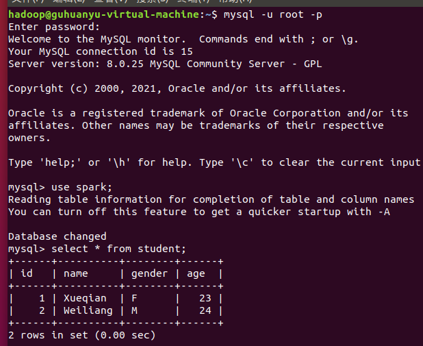 –cp /usr/local/hive/lib/mysql-connector-java-5.1.40-bin.jar /usr/local/spark/jars - 启动 Mysql shell,新建数据库spark,表student。