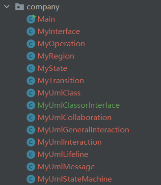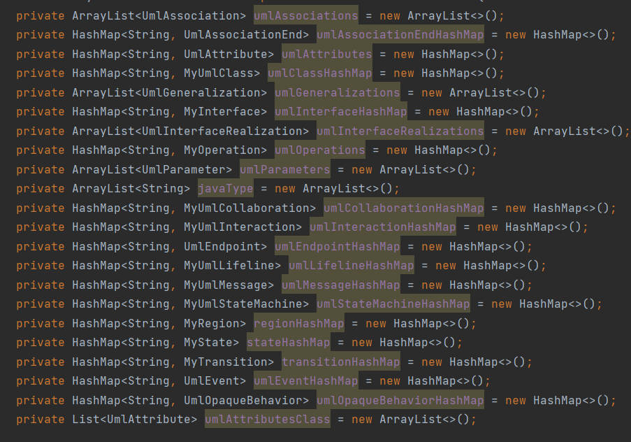 本单元主要需要理解uml规格是如何描述类图、状态图和顺序图以及如何相应对其进行解析。本单元作业架构已由课程组实现,我们只需要补充对应的函数即可。为了实现相应的功能,有一些元素我对其进行了重新创建,并使用某些容器储存,如下图所示: