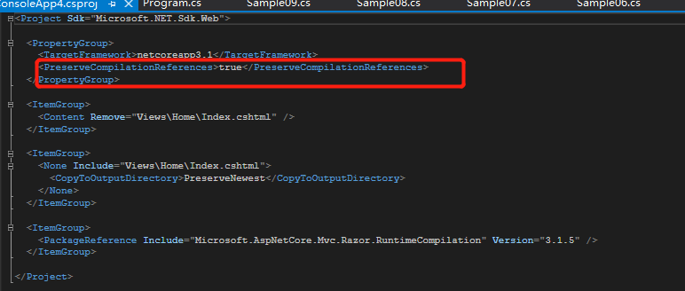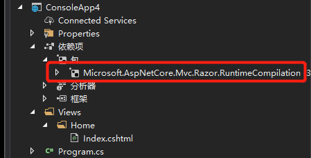 MVC项目中需要添加包 Microsoft.AspNetCore.Mvc.Razor.RuntimeCompilation 同时设置被配表示使用动态编译视图