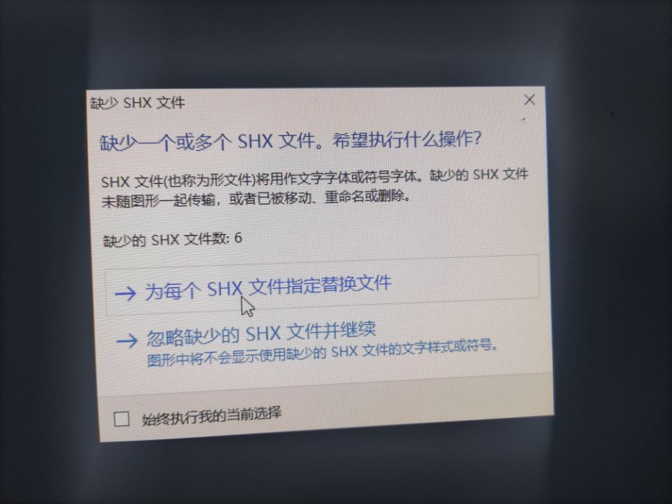 不跳“缺少SHX文件”窗口的话,其实可以通过设置让它每次启动时跳出来。
