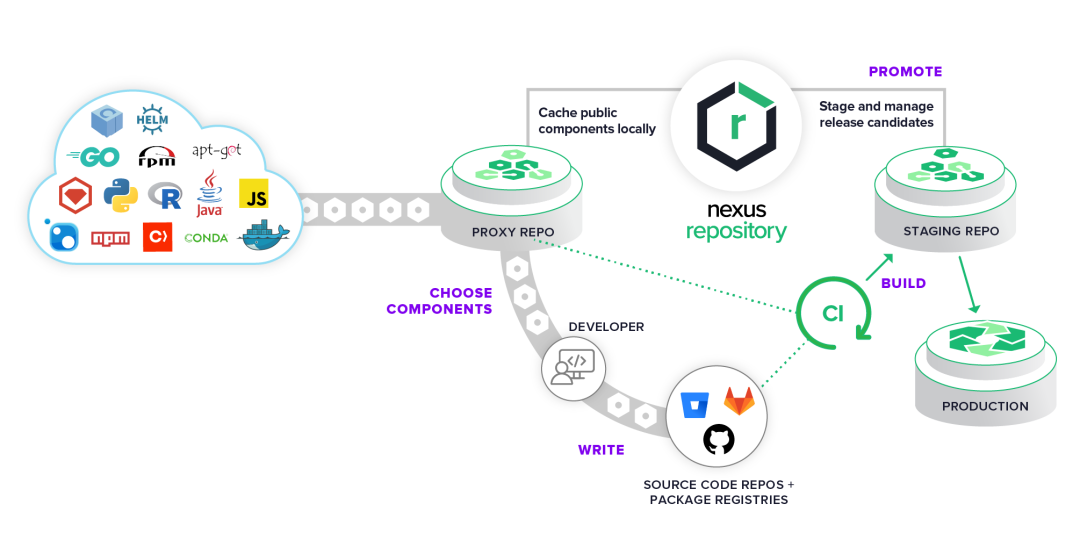 在开发中,我们经常需要下载大量的依赖包,还要将开发好的依赖包进行上传。但是,通常软件依赖源都是国外的服务器,比如 Maven 和 npm源,从国内下载依赖的速度非常慢。虽然下载慢的问题可以通过配置国内镜像源得到一定程度的解决,但是无法直接在公有软件源上传私有包。因此,通常企业都会在内网搭建私有软件源,即内部依赖仓库,便于内部依赖管理,大大提升拉取效率。目前最常用的内部依赖仓库是 Nexus。Nexus 仓库