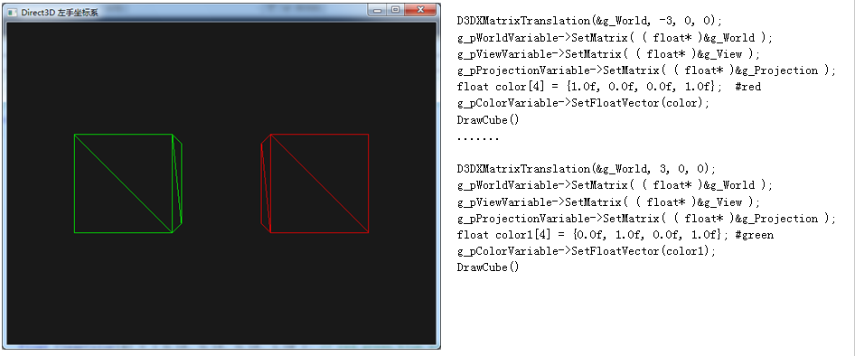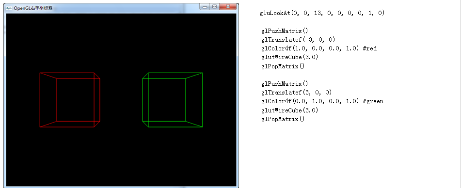出绿色方块的右边。而在OpenGL中,View空间坐标系是Right Hand, Z轴其实是-ViewDirection, 所以结果就是红色的方块出现在绿色方块的左边。