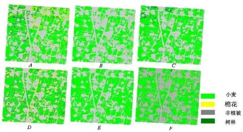 综上所述,环境星多光谱数据可以有效进行农作物分类,但存在田块边界不能有效识别和分类混淆的问题;ASAR VV 极化数据可以改善光学数据的光谱信息,使不同地物之间的光谱差异有显著增大,增强了地物之间的可分性; VV 极化数据对田间非耕地信息敏感,对田块边界的识别有较大作用;VV 极化数据对于地物结构信息敏感,造成田块边界存在微小程度的扩大,致使分类结果中小麦面积比例略有下降,但相对于分类精度的提高是值得的。