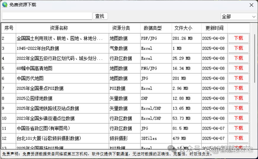 点击主界面底部的“免费资源下载”按钮,你可以搜索名称找到对应的数据,然后点击右侧的“下载”按钮即可下载。
