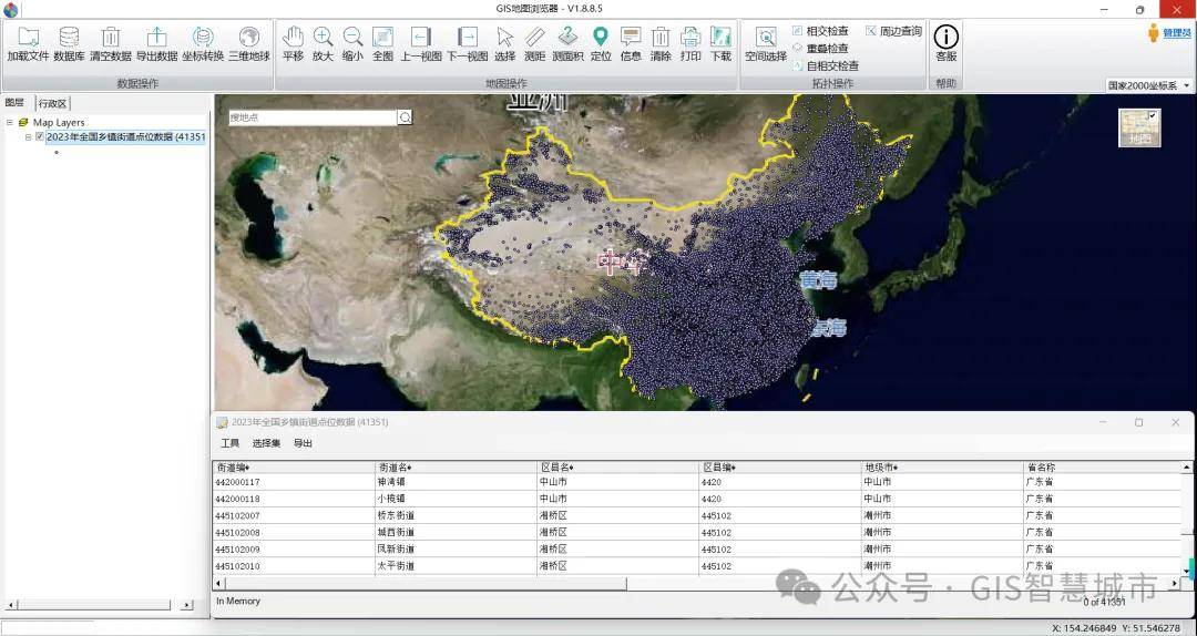 以下将全国乡镇街道点位shp数据加载到"GIS地图浏览器”中查看。GIS地图浏览器的界面操作简单,功能强大,是一款轻量型的arcmap。