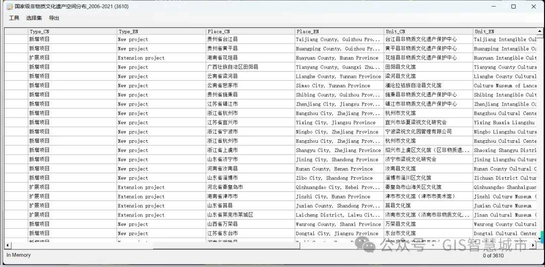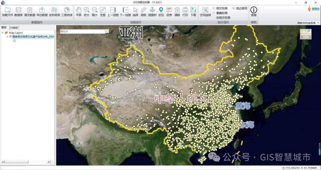 以下将国家级非物质文化遗产点位数据加载到"GIS地图浏览器”中查看。GIS地图浏览器的界面操作简单,功能强大,是一款轻量型的arcmap。