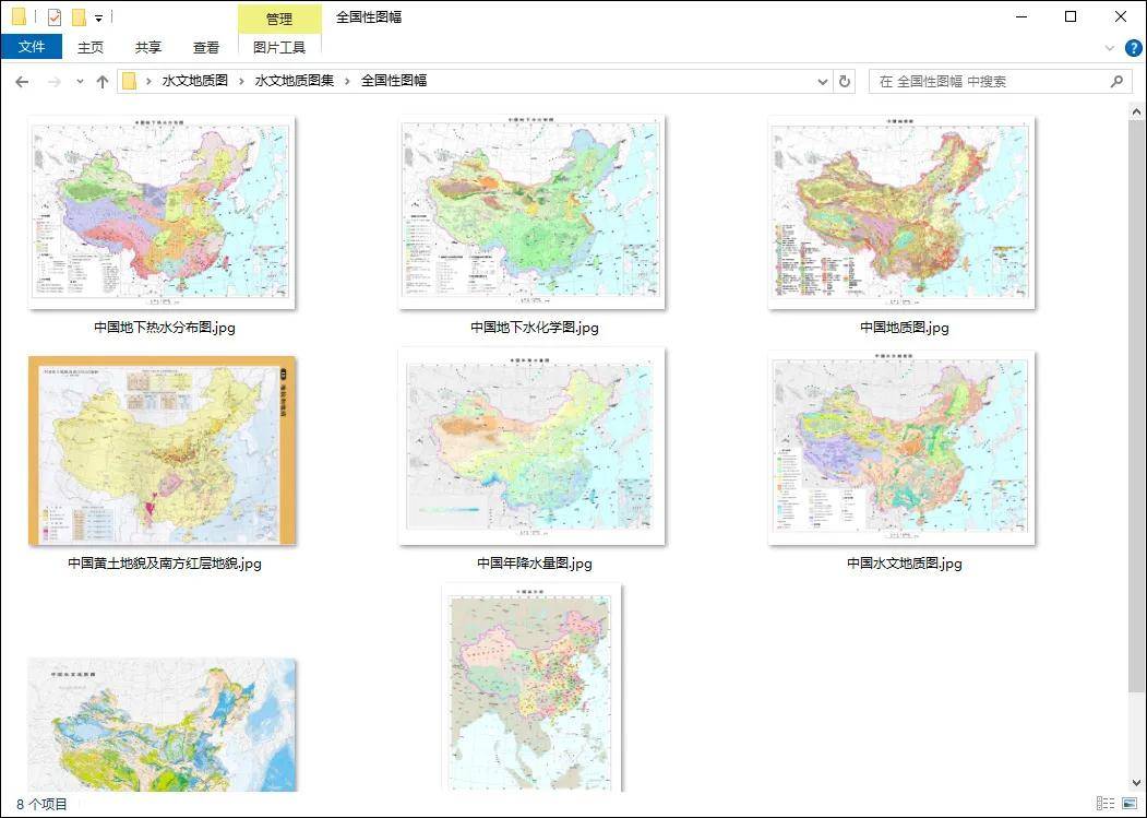 “全国性图幅”包括地下热水分布图、地下水化学图、年降水量图、水文地质图等。