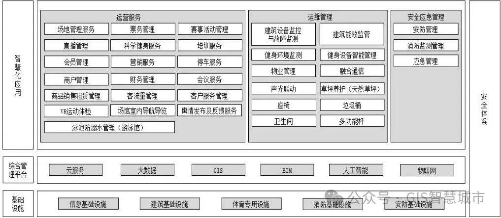 基于《体育场馆智慧化建设规范》的顶层设计,智慧场馆构建“应用层-平台层-设施层-安全层”四位一体的系统架构: