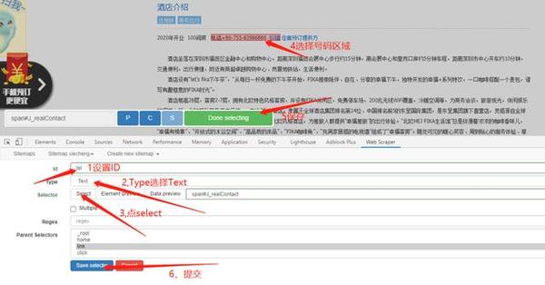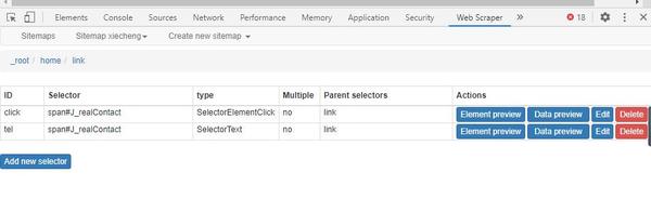9,在有联系方式的页面摁F12》Web Scraper》xiecheng》home》点进去link里面,点Add new selector,填好Id,Type选择Element click,然后Selector和Click selector的Select都一起选择页面的联系方式后点击done selecting,(还可以点一下Data preview,测试下会不会自动显示号码出来)提交保存这个用于点开联系方式。