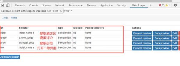 6,注意是点进去home里面后再Add new selector哦,然后填写一下Id,这次要爬取的是文本信息,所以Type选择的是Text,Multiple不用打勾,Selector直接鼠标选取想要提取的文本即可,然后保存。记得要一个一个设置,比如把采集酒店名称的参数设置好后,再在同个页面点多一次Add new selector设置采集价格的参数后保存,采集几个信息就保存几次。