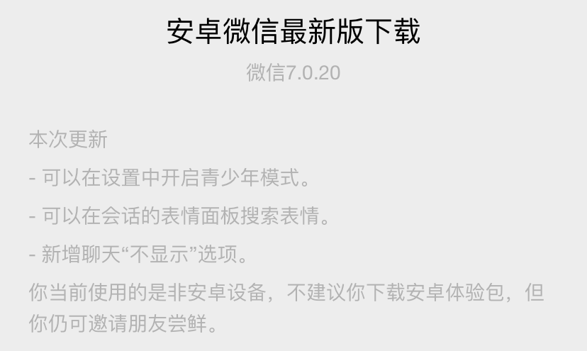 内测版本中官方说明中只更新了“可开启青少年模式”、“可搜索表情包”、“新增聊天不显示选项”。另外,安卓版本也能跟ios一样支持朋友圈话题功能,和支持手机、安卓平板、iPad三个同时在线登陆微信