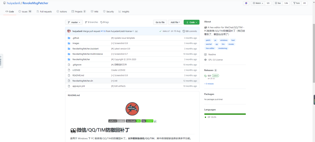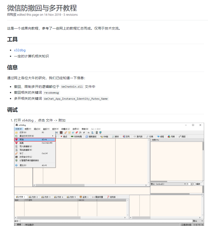 这次分享的开源项目也是关于微信的,一个能让微信防撤回和多开的程序--RevokeMsgPatcher