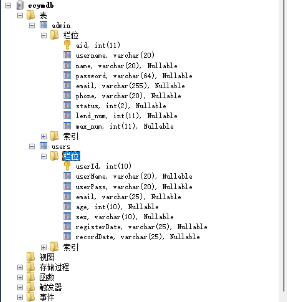 CREATE TABLE `admin` ( `aid` int(11) NOT NULL AUTO_INCREMENT, `username` varchar(20) CHARACTER SET gbk COLLATE gbk_bin NOT NULL, `name` varchar(20) DEFAULT NULL, `password` varchar(64) DEFAULT NULL, `email` varchar(255) DEFAULT NULL, `phone` varchar(20) DEFAULT NULL, `status` int(2) DEFAULT '1', `lend_num` int(11) DEFAULT NULL, `max_num` int(11) DEFAULT NULL, PRIMARY KEY (`aid`) ) ENGINE=MyISAM AUTO_INCREMENT=6 DEFAULT CHARSET=gbk |