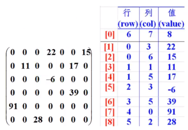//转换为稀疏数组来保存。 int[][] array2=new int[sum+1][3]; array2[0][0]=11; array2[0][1]=11; array2[0][2]=sum; int count=0; for (int i = 0; i < array1.length; i++) { for (int j = 0; j <array1[i].length ; j++) { if(array1[i][j]!=0) { count++; array2[count][0] = i; array2[count][1] = j; array2[count][2] = array1[i][j]; } } }