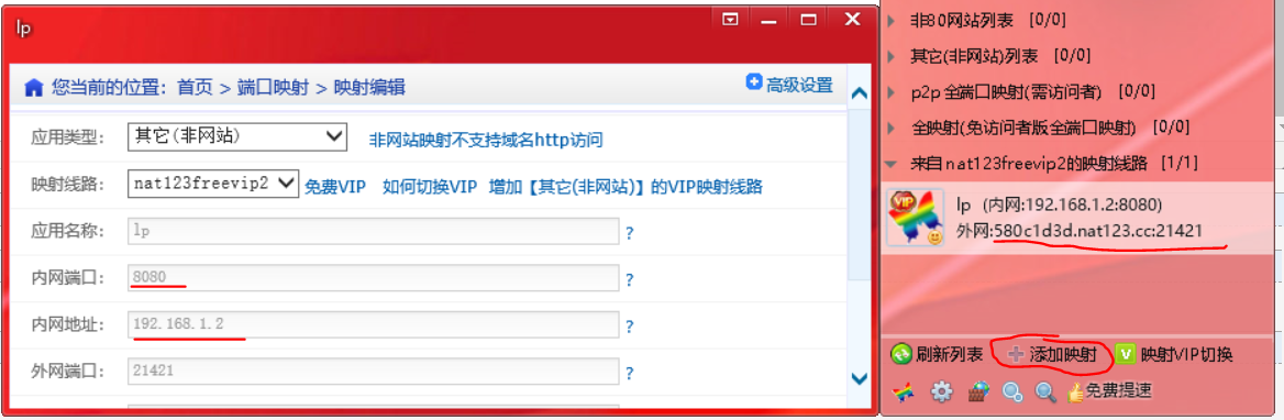 1.添加映射 2. 配置内网端口 3.配置内网地址:进cmd中ipconfig中获取ipv4填入即可 4.访问者只需访问外网580……即可,相当于localhost:8080
