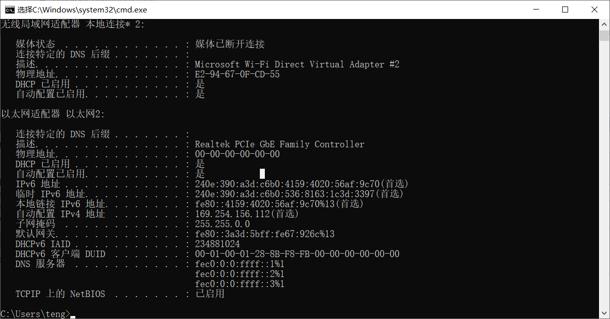 3、cmd下ipconfig /all可以看到dhcp分配的ip是169.254.156.112,很明显这个ip有问题,正常的应该是192.168开头的