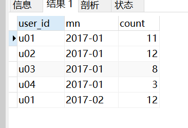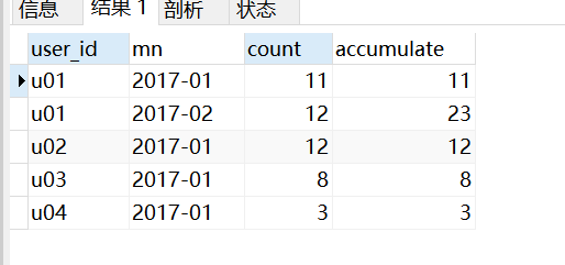 select user_id,mn,count,sum(count)over(PARTITION by user_id ORDER BY mn) as accumulate from (