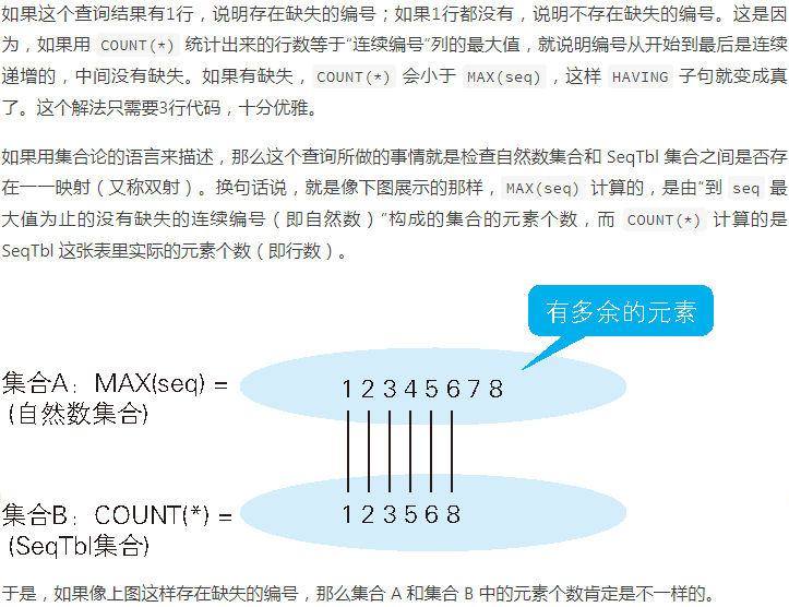 -- 如果有查询结果,说明存在缺失的编号 SELECT '存在缺失的编号' AS gap FROM Class_B HAVING COUNT(*) <> MAX(id);个人理解等 count(*) <> max(id) 同于 (SELECT count(0) FROM Class_B) <> (SELECT MAX(id) from Class_B)