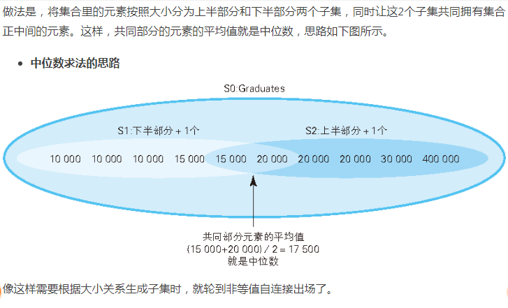这条 SQL 语句的要点在于比较条件“>= COUNT(*)/2”里的等号,这个等号是有意地加上的。加上等号并不是为了清晰地分开子集 S1 和 S2,而是为了让这2个子集拥有共同部分。如果去掉等号,将条件改成“>COUNT(*)/2”,那么当元素个数为偶数时,S1 和 S2 就没有共同的元素了,也就无法求出中位数了。