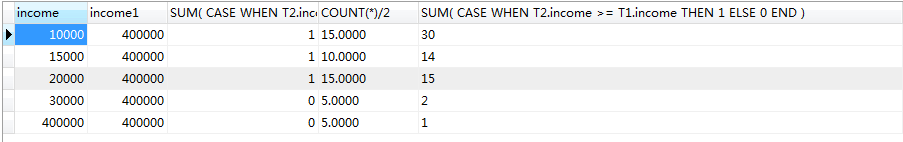 -- 自连接 有序对查询 100条 SELECT * FROM Graduates T1, Graduates T2; -- 把100条 GROUP BY T1.income后 分组成5组 SELECT T1.income, T2.income, SUM( CASE WHEN T2.income >= T1.income THEN 1 ELSE 0 END ) >= COUNT(*) / 2 , COUNT(*)/2 ,SUM( CASE WHEN T2.income >= T1.income THEN 1 ELSE 0 END ) FROM Graduates T1, Graduates T2 GROUP BY T1.income -- 最后再判断分组后的数据 是否符合查询查询条件 SELECT T1.income, T2.income, SUM( CASE WHEN T2.income >= T1.income THEN 1 ELSE 0 END ) >= COUNT(*) / 2 , COUNT(*)/2 ,SUM( CASE WHEN T2.income >= T1.income THEN 1 ELSE 0 END ) FROM Graduates T1, Graduates T2 GROUP BY T1.income
