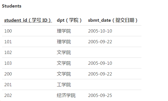 问题: 查询“提交日期”列内不包含 NULL 的学院