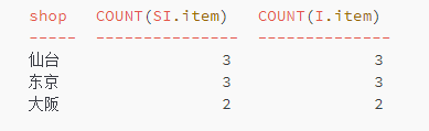 注意,如果把 HAVING 子句改成 HAVING COUNT(SI.item)=COUNT(I.item),结果就不对了。如果使用这个条件,仙台、东京、大阪这3个店铺都会被选中。这是因为,受到连接操作的影响,COUNT(I.item) 的值和表 Items 原本的行数不一样了。下面的执行结果一目了然。