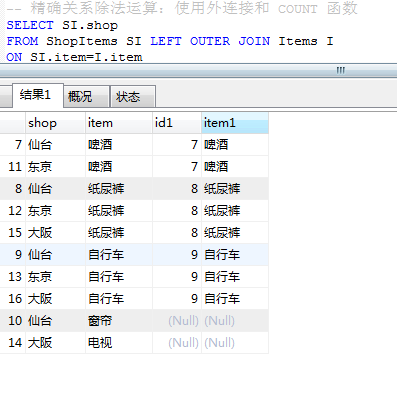 如何排除掉仙台店(仙台店的仓库中存在“窗帘”,但商品表里没有“窗帘”),让结果里只出现东京店。这类问题被称为“精确关系除法”(exact relational division),即只选择没有剩余商品的店铺(与此相对,前一个问题被称为“带余除法”(division with a remainder))。解决这个问题我们需要使用外连接。