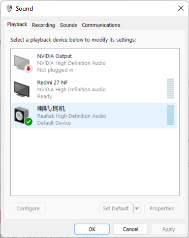 解决问题:win+R输入control以打开控制面板;选择硬件和声音;选择声音;会出现如图所示的扬声器(显示器和笔记本各一个)