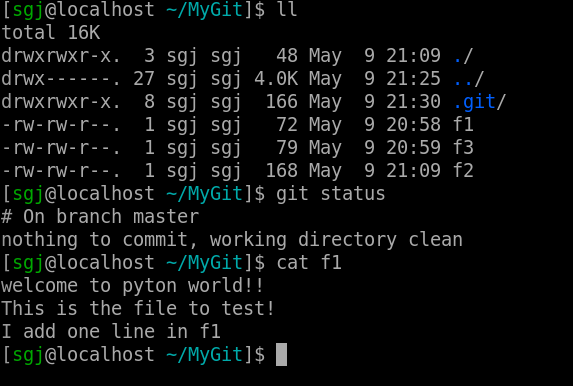 发现没有什么变化,因为我刚刚把f1从本地仓库提交到暂存区,而git diff的作用就是比较本地和暂存区文件的差异