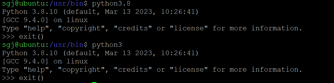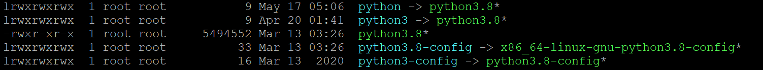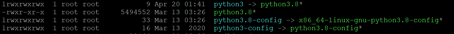 可以看到/usr/bin下的python3是一个符号链接,准确地说是可执行文件python3.8的软链接,因此我们执行命令python3的时候实际上执行的是python3.8这个可执行文件