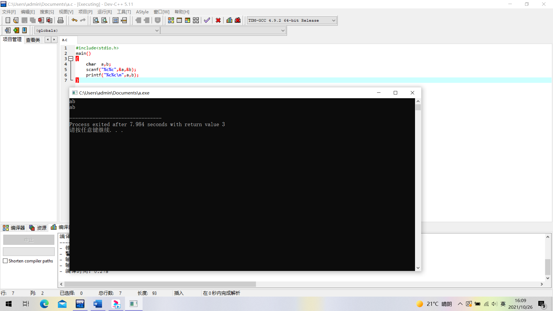 8. 编写程序,通过scanf()函数接收两个字符变量,并输出。