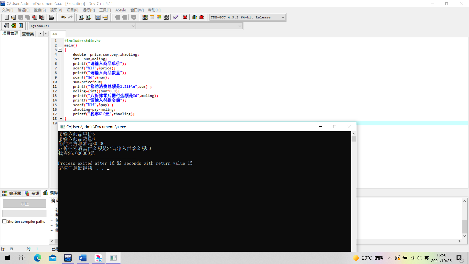 输入单价,数量,计算总价,打折,抹零,输入付款金额,输出找零。