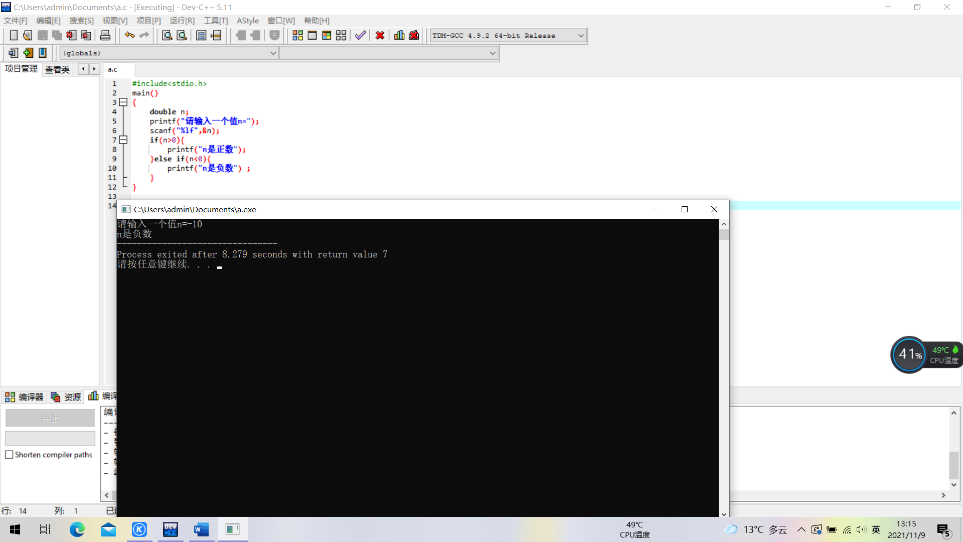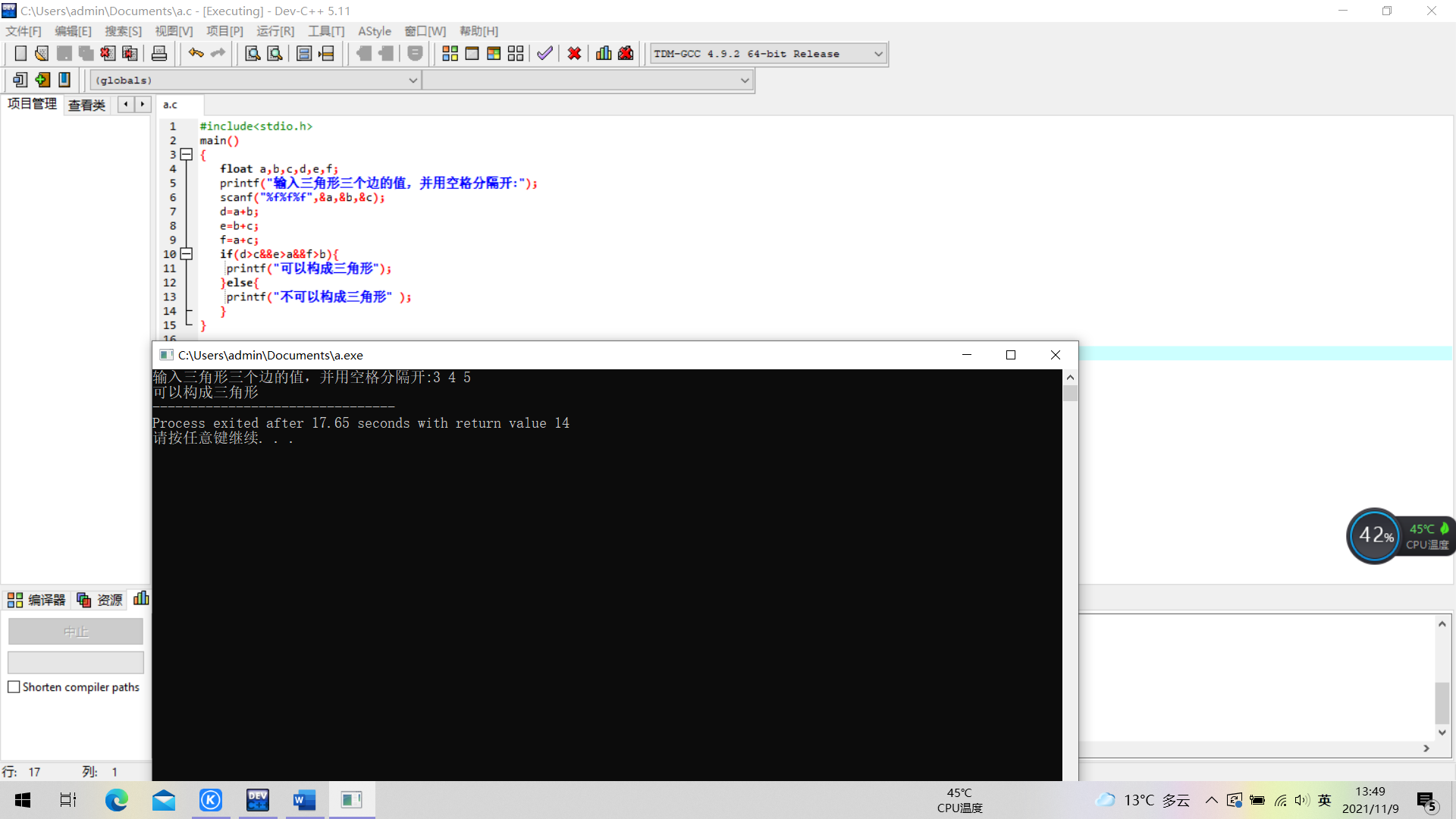 printf("输入三角形三个边的值,并用空格分隔开:");