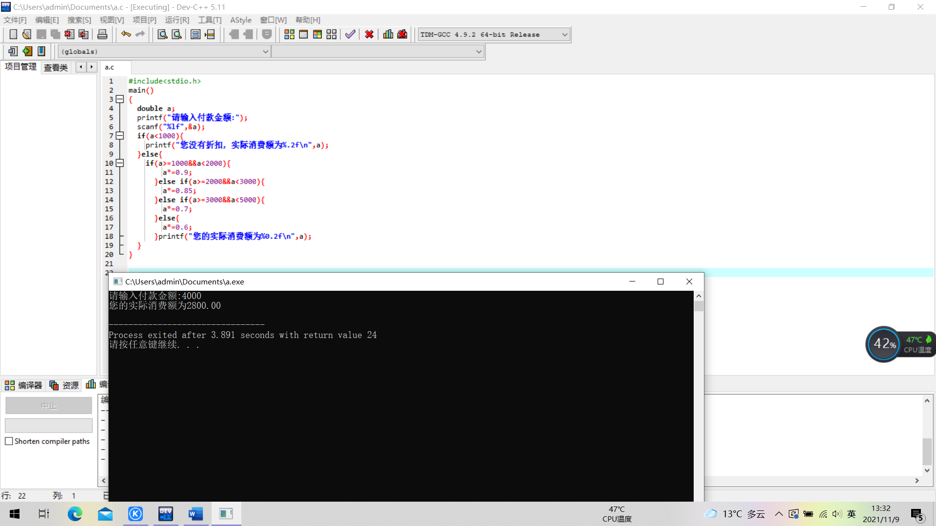 printf("您没有折扣,实际消费额为%.2f\n",a);