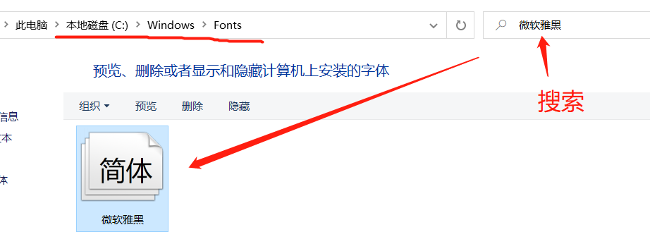 ②访问本地磁盘C:\Windows\Fonts,寻找微软雅黑字体,复制到桌面,删除加粗字体