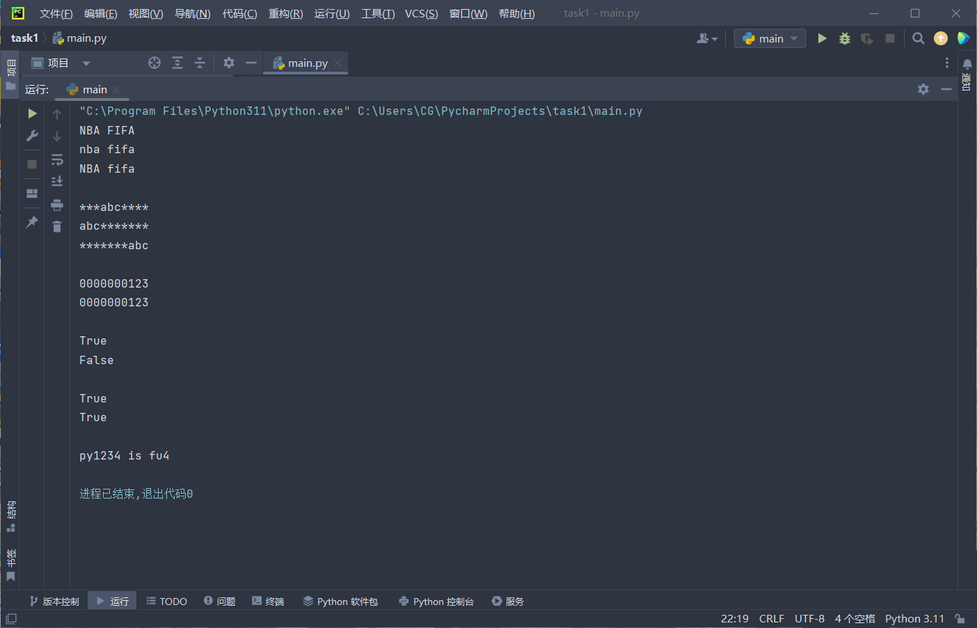 x='nba FIFA' print(x.upper()) print(x.lower()) print(x.swapcase()) print() x='abc' print(x.center(10,'*')) print(x.ljust(10,'*')) print(x.rjust(10,'*')) print() x='123' print(x.zfill(10)) x=123 print(str(x).zfill(10)) print() x='phone_number' print(x.isidentifier()) x='222test' print(x.isidentifier()) print() x=' ' print(x.isspace()) x='\n' print(x.isspace()) print() x='python is fun' table=x.maketrans('thon','1234') print(x.translate(table))