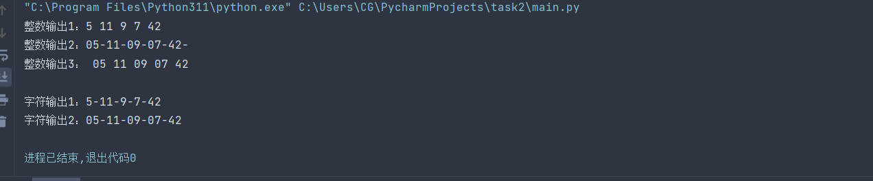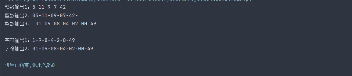 x=[5,11,9,7,42] print('整数输出1:',end='') i=0 while i < len(x): print(x[i],end=' ') i+=1 print('\n整数输出2:',end='') i=0 while i <len(x): print(f'{x[i]:02d}',end='-') i+=1 x=[1,9,8,4,2,0,49] print('\n整数输出3:',end=' ') i=0 while i < len(x)-1: print(f'{x[i]:02d}',end=' ') i+=1 print(f'{x[-1]:02d}') print('\n字符输出1:',end='') y1=[] i=0 while i < len(x): y1.append(str(x[i])) i+=1 print('-'.join(y1)) print('字符输出2:',end='') y2=[] i=0 while i < len(x): y2.append(str(x[i]).zfill(2)) i+=1 print('-'.join(y2))
