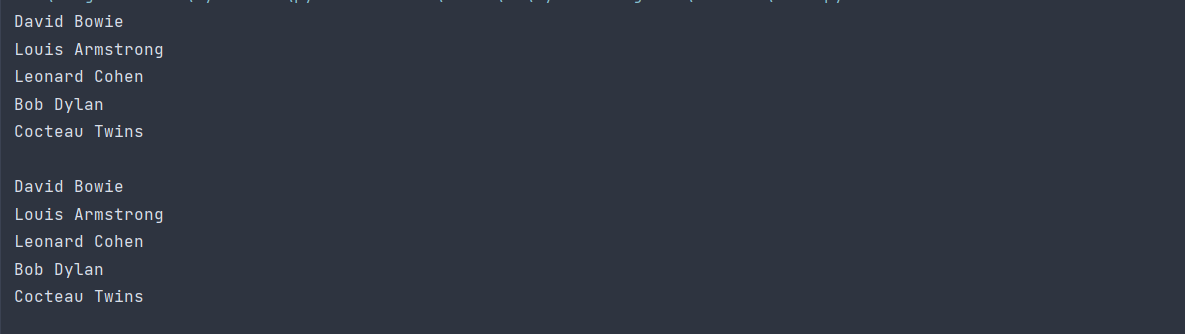 name_list=['david bowie','louis armstrong','leonard cohen','bob dylan','cocteau twins'] i=0 while i < len(name_list): print(name_list[i].title()) i+=1 print() t=[] i=0 while i < len(name_list): t.append(name_list[i].title()) i+=1 print('\n'.join(t))