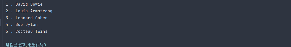 name_list=['david bowie','louis armstrong','leonard cohen','bob dylan','cocteau twins'] i=0 while i<len(name_list): print(i+1,'.',name_list[i].title()) i+=1