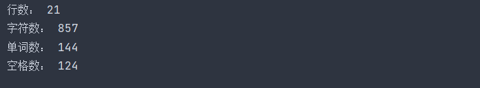 x=""" The Zen of Python, by Tim Peters Beautiful is better than ugly. Explicit is better than implicit. Simple is better than complex. Complex is better than complicated. Flat is better than nested. Sparse is better than dense. Readability counts. Special cases aren't special enough to break the rules. Although practicality beats purity. Errors should never pass silently. Unless explicitly silenced. In the face of ambiguity, refuse the temptation to guess. There should be one-- and preferably only one --obvious way to do it. Although that way may not be obvious at first unless you're Dutch. Now is better than never. Although never is often better than *right* now. If the implementation is hard to explain, it's a bad idea. If the implementation is easy to explain, it may be a good idea. Namespaces are one honking great idea -- let's do more of those! """ print('行数:',x.count('\n')) alpha=0 b=0 for i in x: if i.isalpha(): alpha+=1 else: b+=1 print('字符数:',alpha+b) word=len(x.split()) print('单词数:',word) print('空格数:',x.count(' '))